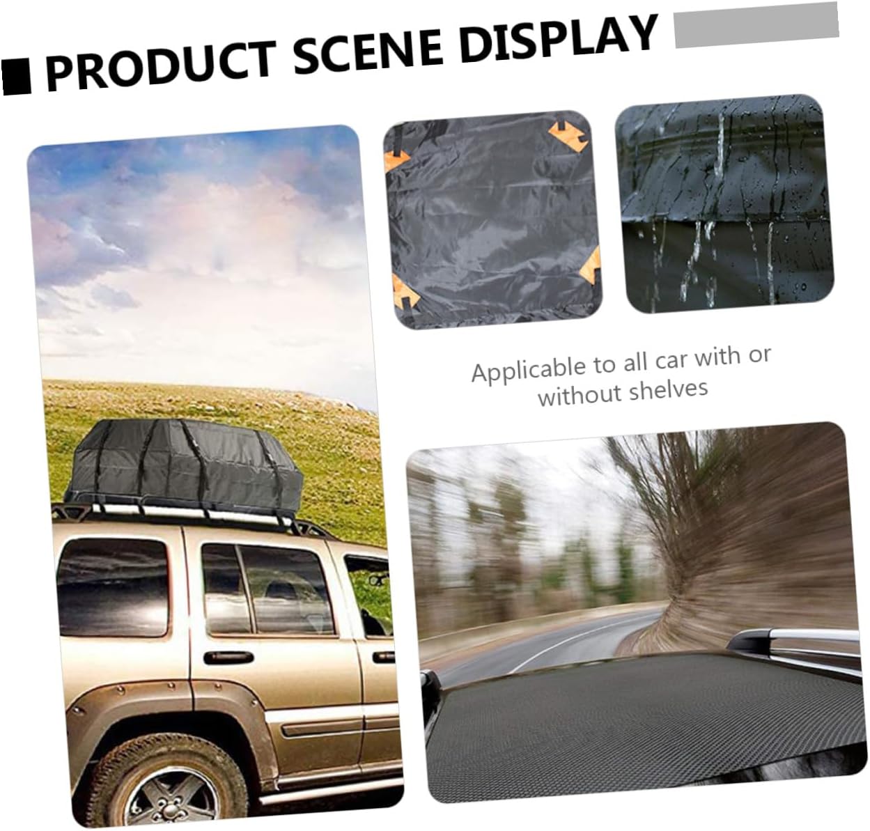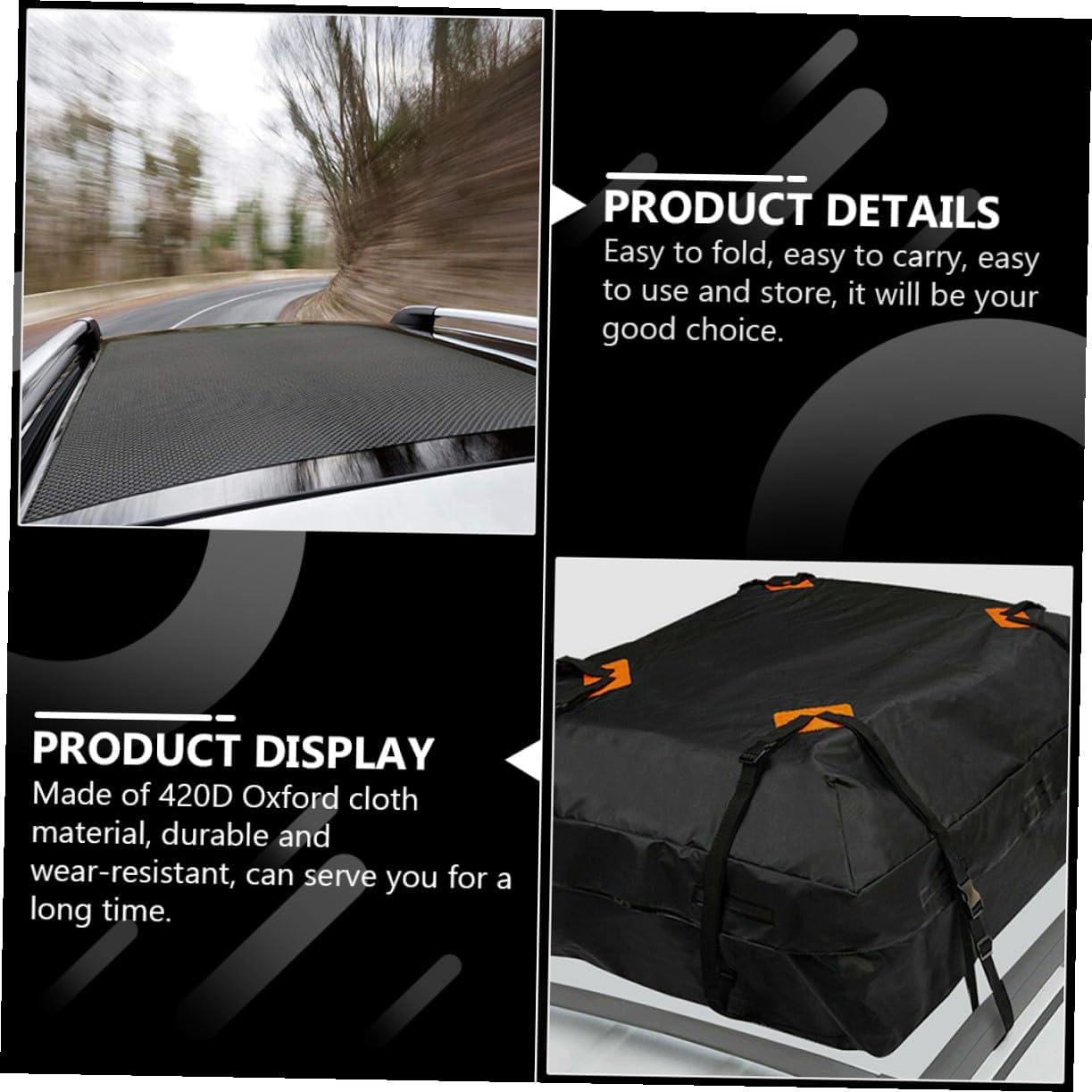Package List 1 roof bag Characteristics -Color: Black waterproof rooftop cargo carrier. -Material: 420D Oxford cloth roof cargo bag. -Product Info:Waterproof luggage bag -Size: About 112.00X87.00X44.00cm/44.02X34.19X17.29inch Car Roof Cargo Holder. -It has a foldable design and can be easily put into the trunk when not in use carrier bag storage. -This roof bag can easily store your luggage and belongings, providing you with extra storage space rooftop cargo carrier. -The installation method is simple, and it can be easily and stably fixed, providing you with convenient and easy storage method waterproof car roof bag. -Preferred materials, , safe, durable and practical car roof bag. -You can buy this efficient and convenient roof storage bag at an car roof cargo carrier.Goods DescriptionAuto Rooftop Cargo has a reasonable design and practical functions.roof cargo carrier It is easy to use and can help you store your luggage and create more usable storage space.Car Roof Cargo Holder It is made of excellent technology, durable and wear-resistant, not easy to tear, and can be durable for a long time.car pouch It will be your good storage choice.carrier roof bag This is a roof luggage bag made of 420D Oxford cloth